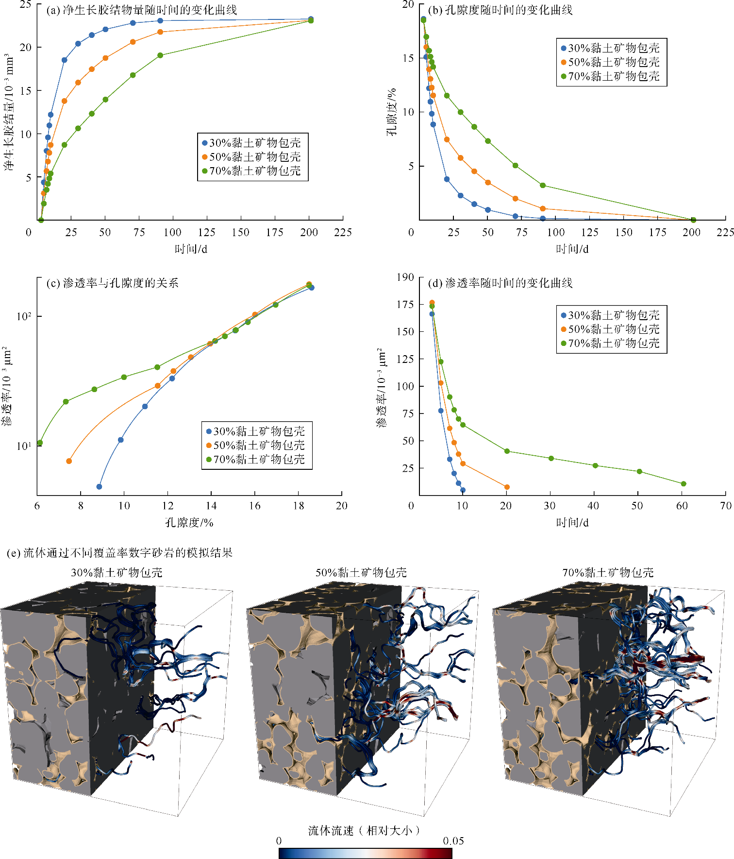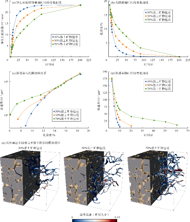 图10a的胶结量随时间变化曲线也可以发现。速度流线描述了胶结大约10 d后,通过3种不同包壳覆盖率砂岩的流体流动情况,与包壳覆盖率较低的砂岩相比,包壳覆盖率较高的砂岩的孔隙连通性较好(见