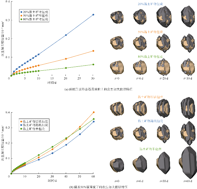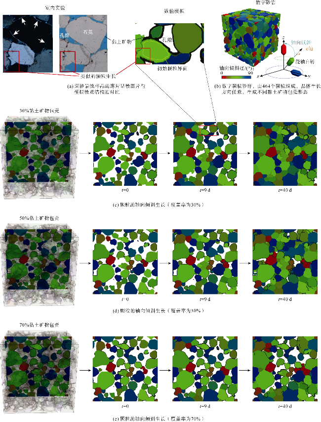 图9e)。包壳覆盖率较高的砂样胶结程度较低,因此在所有阶段都具有较高的孔隙空间。在模拟时间达到40 d后,孔隙空间的差异最为明显。在胶结物生长、孔隙空间和黏土包壳方面,模拟得到的黏土包壳微观结构与天然样品相似(见