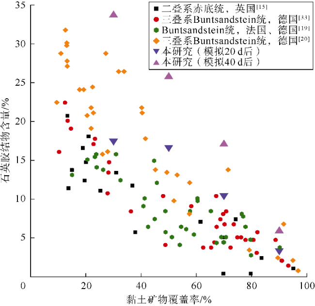 [13]。然而,在其他天然样品系列中很少发现这种理想的相关性,可能由于以下因素造成:其他天然样品中含有堵塞孔隙空间的其他非石英胶结物;黏土矿物包壳结构(切向型、径向型或孔隙桥接型)也会影响渗透率