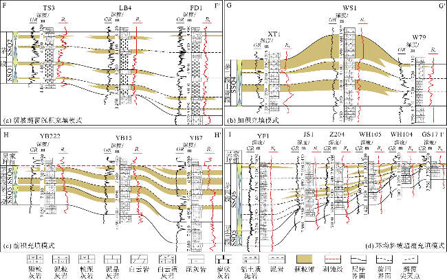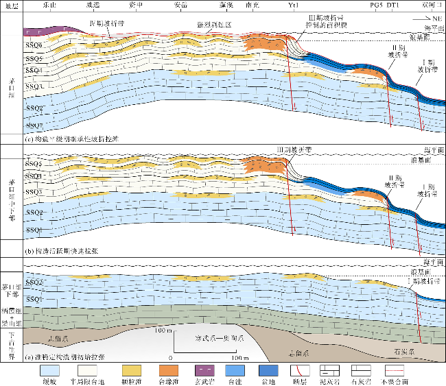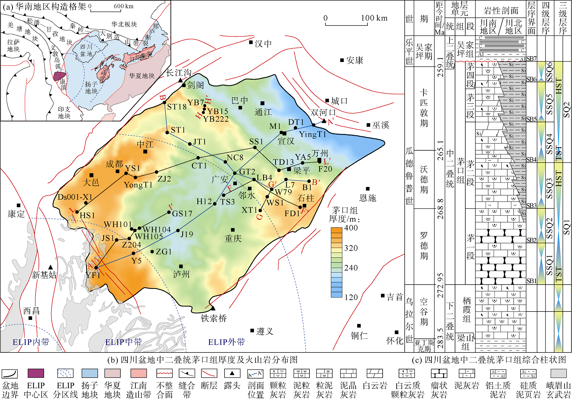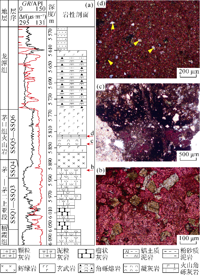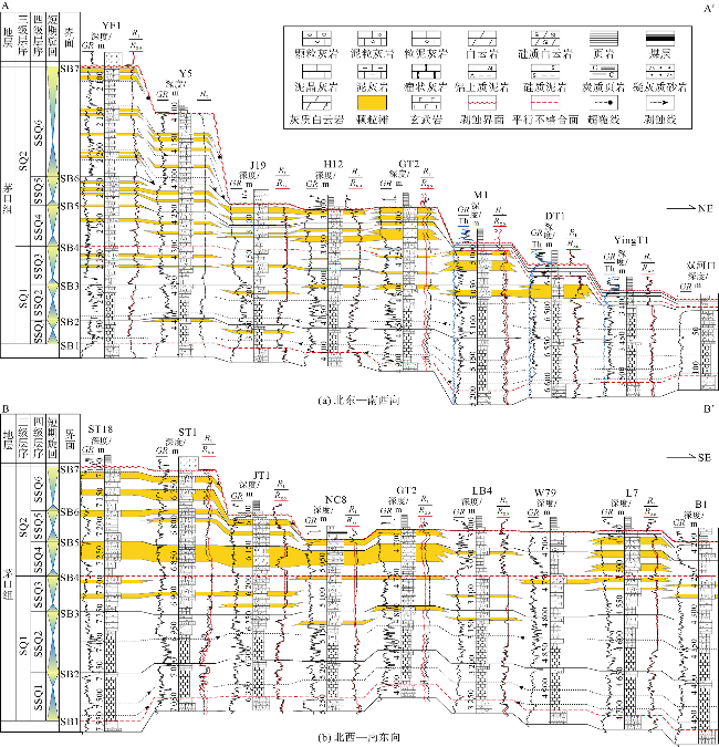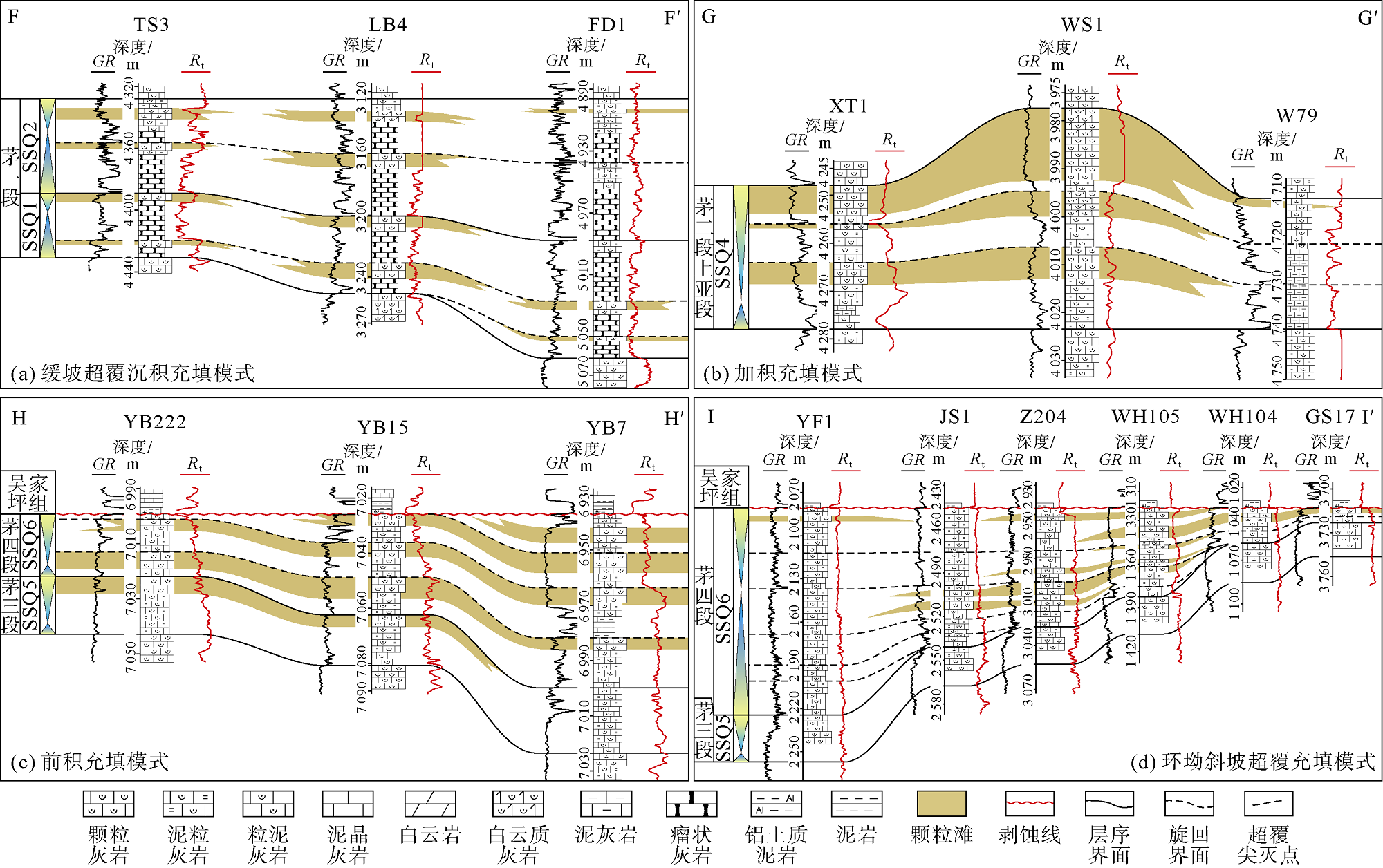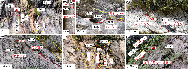 图2 四川盆地茅口组层序界面特征(图中黄色虚线为岩层面,箭头表示地层超覆方向)(a)SB1,新基姑剖面,薄层紫红色古土壤或暴露溶蚀;(b)SB2,ZG1井,3 302.8~3 303.1 m,发育垂直溶沟的角砾灰岩;(c)SB3,双河口剖面,从石灰岩向硅质页岩的岩性突变;(d)SB4,长江沟剖面,从厚层块状颗粒石灰岩向薄层泥晶灰岩的岩性转变;(e)SB5,铁索桥剖面,岩性变化、溶沟和岩溶角砾发育;(f)SB6,新基姑剖面,岩溶角砾发育和上覆层序的超覆沉积;(g)SB7,长江沟剖面,茅口组与吴家坪组不整合接触,发育2.5 m厚王坡页岩段(铝土质泥岩) |