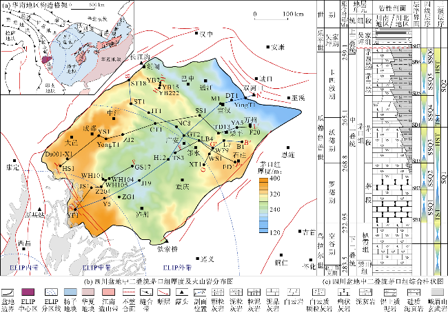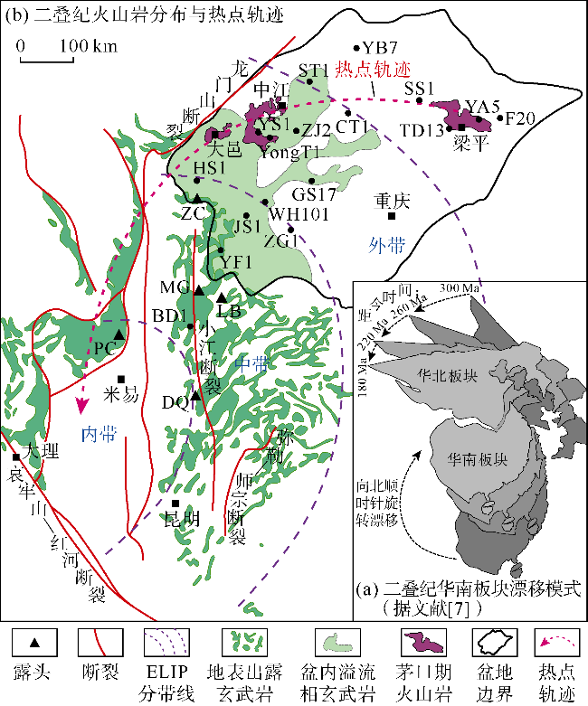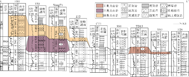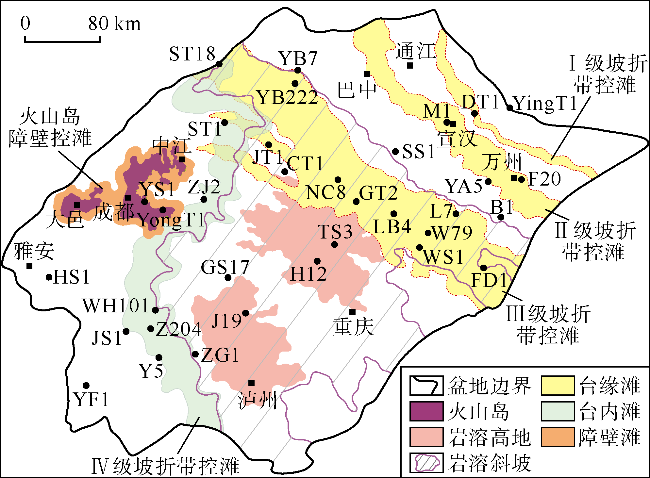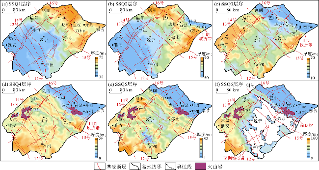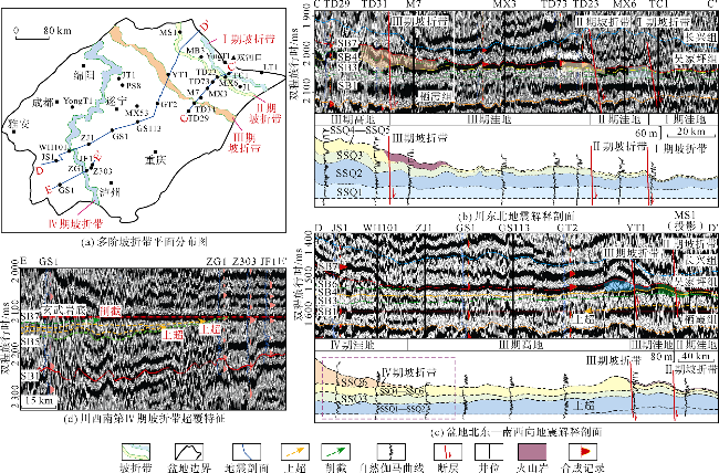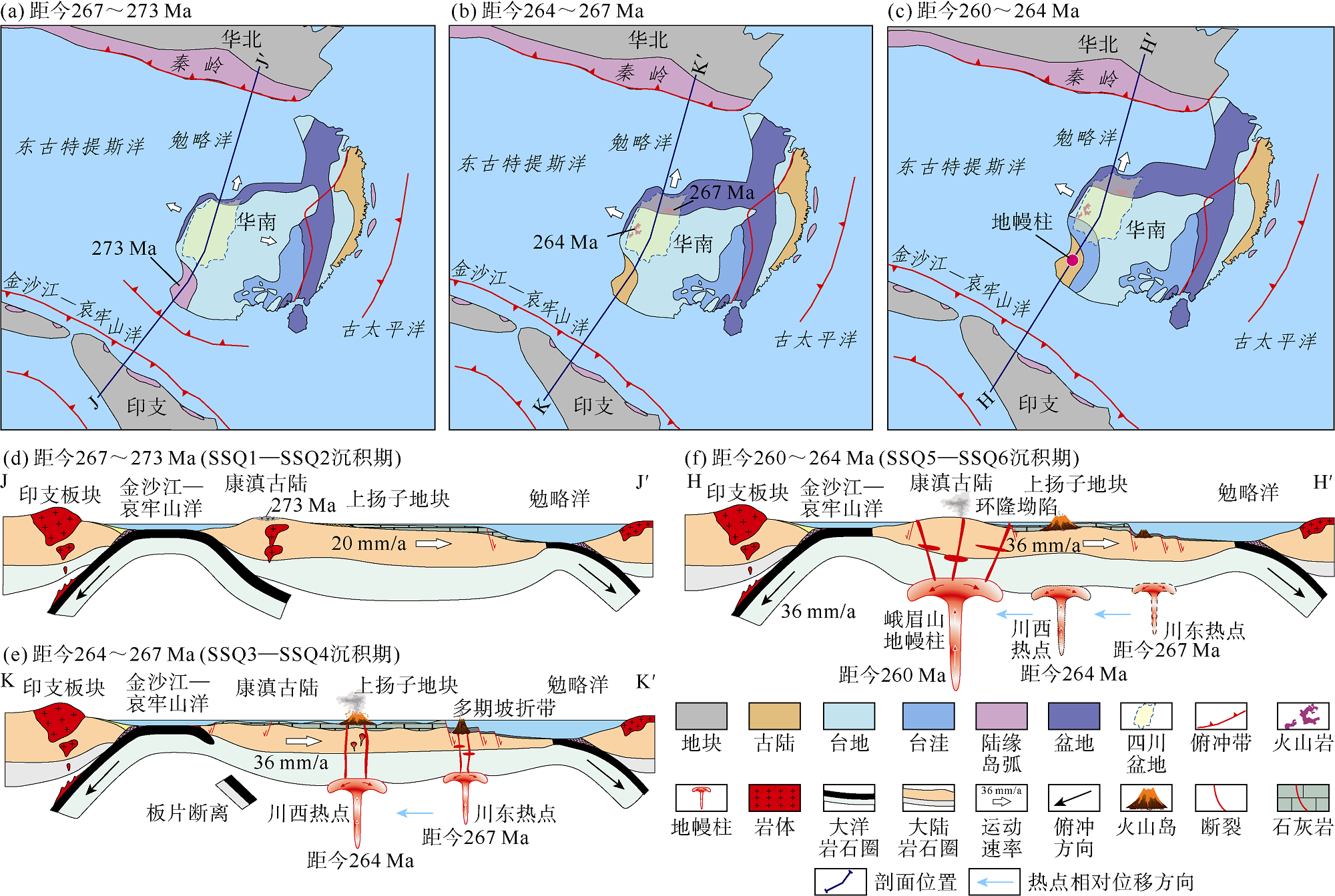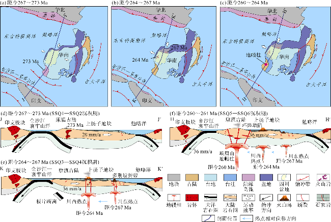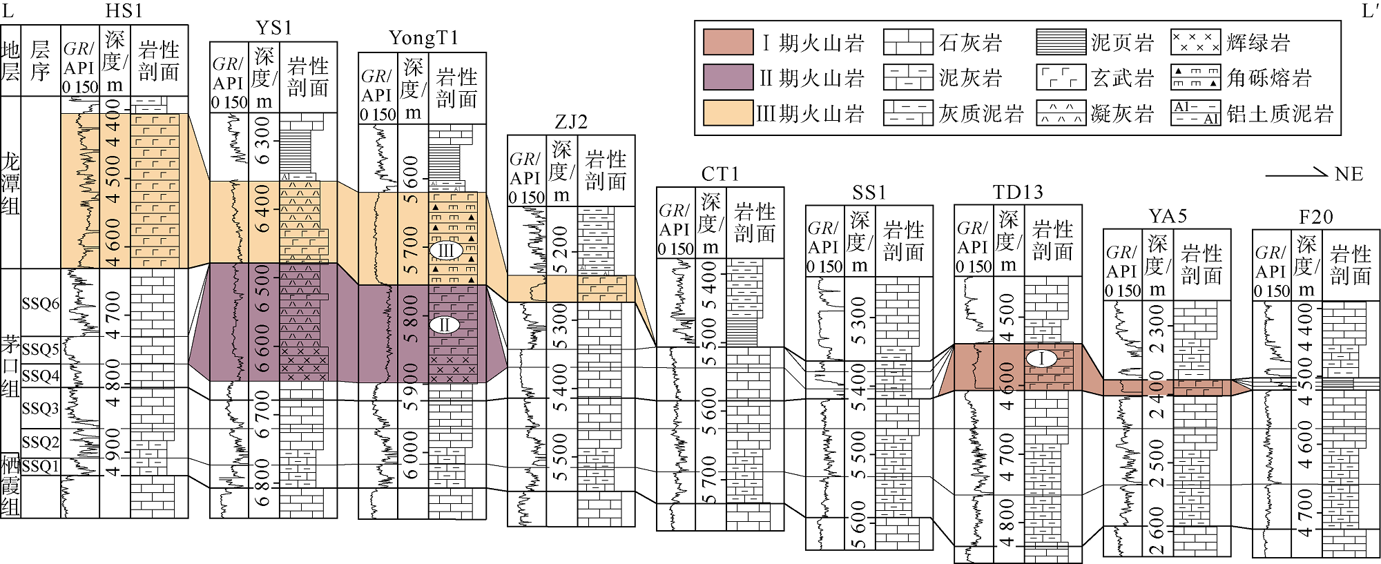 图2 四川盆地茅口组层序界面特征(图中黄色虚线为岩层面,箭头表示地层超覆方向)(a)SB1,新基姑剖面,薄层紫红色古土壤或暴露溶蚀;(b)SB2,ZG1井,3 302.8~3 303.1 m,发育垂直溶沟的角砾灰岩;(c)SB3,双河口剖面,从石灰岩向硅质页岩的岩性突变;(d)SB4,长江沟剖面,从厚层块状颗粒石灰岩向薄层泥晶灰岩的岩性转变;(e)SB5,铁索桥剖面,岩性变化、溶沟和岩溶角砾发育;(f)SB6,新基姑剖面,岩溶角砾发育和上覆层序的超覆沉积;(g)SB7,长江沟剖面,茅口组与吴家坪组不整合接触,发育2.5 m厚王坡页岩段(铝土质泥岩) |