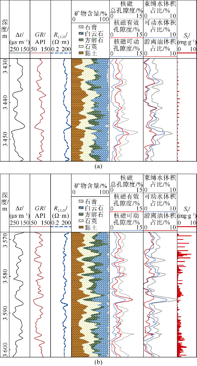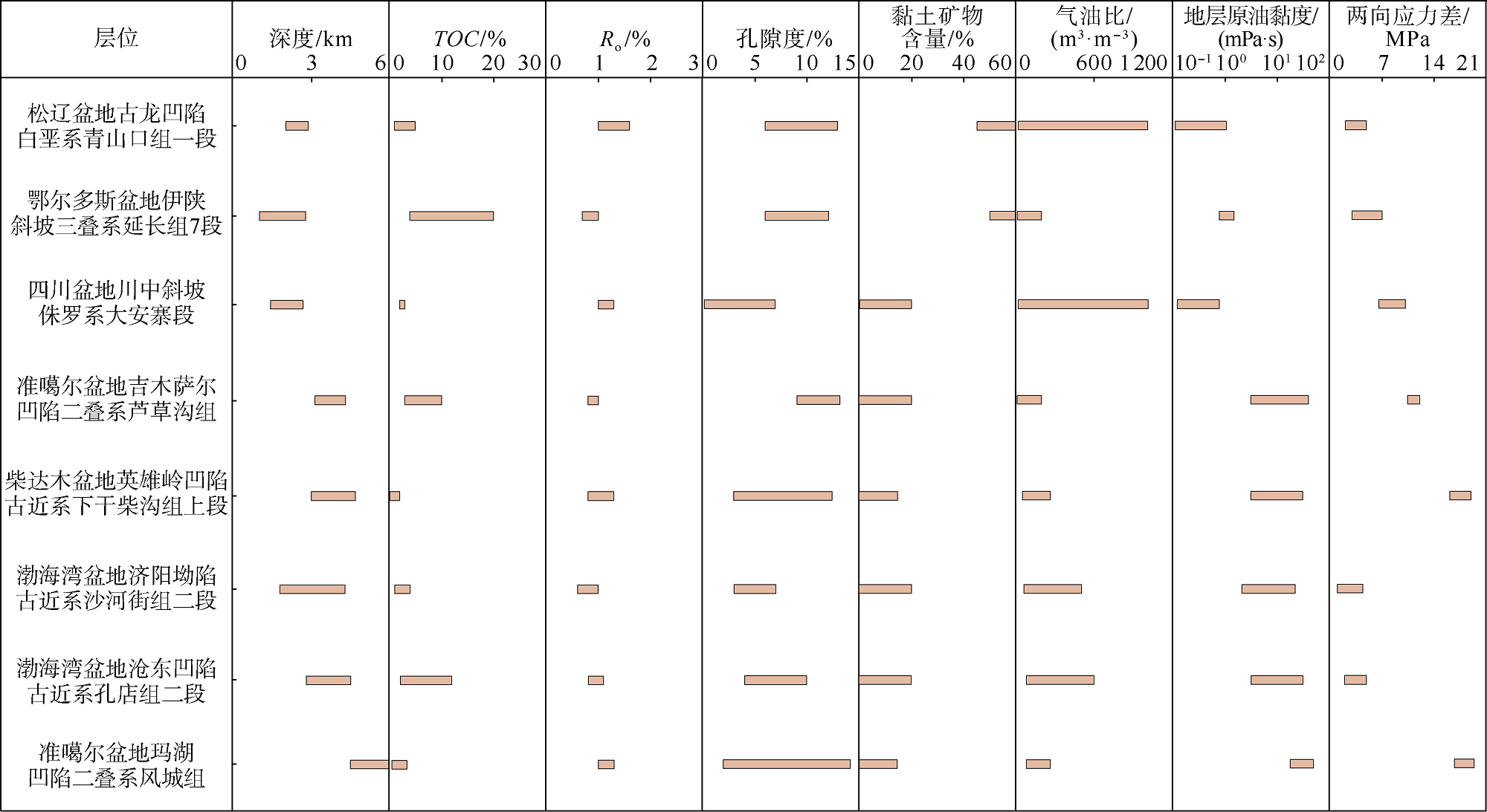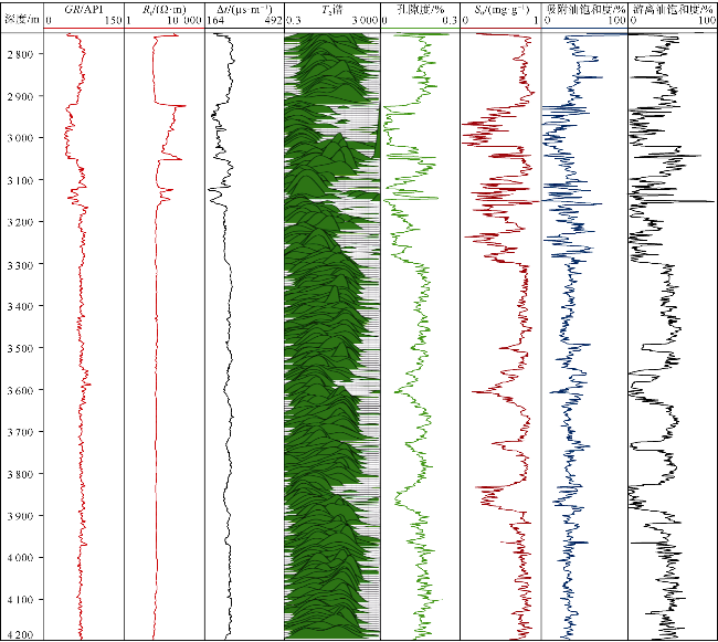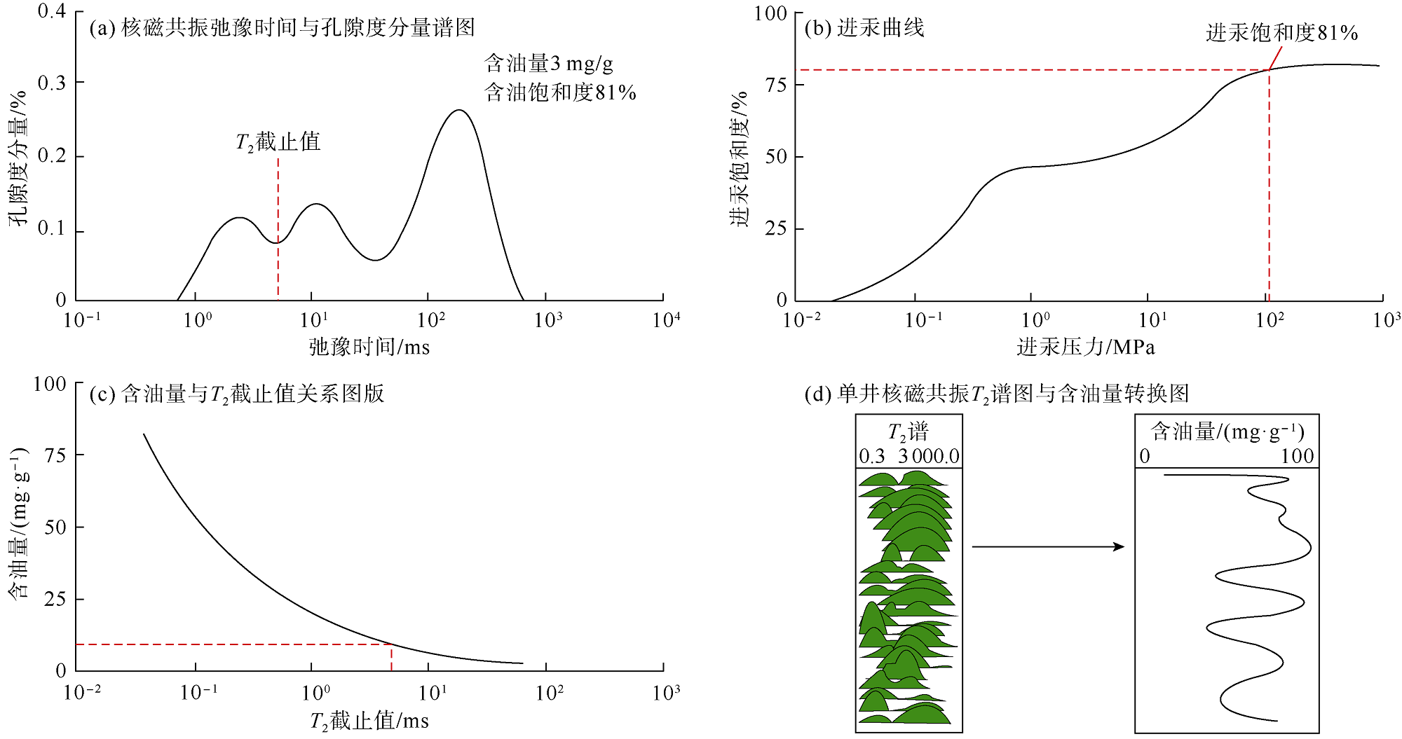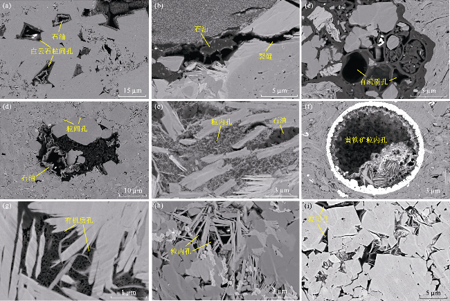 图2 典型陆相页岩油储层孔隙结构与含油岩心扫描电镜照片(a)白云石粒间孔,J10012井3 182 m,准噶尔盆地吉木萨尔凹陷芦草沟组;(b)微裂缝,J10022井3 486 m,准噶尔盆地吉木萨尔凹陷芦草沟组;(c)有机质孔,古页2HC井2 320 m,松辽盆地古龙凹陷青山口组;(d)石英与伊利石粒间孔,古页1HC井2 518 m,松辽盆地古龙凹陷青山口组;(e)伊利石粒内孔,古页2HC井2 318 m,松辽盆地古龙凹陷青山口组;(f)黄铁矿粒内孔,古页2HC井2 280 m,松辽盆地古龙凹陷青山口组;(g)有机质孔,古页8HC井2 530 m,松辽盆地古龙凹陷青山口组;(h)伊蒙混层粒内孔,张22井1 605 m,鄂尔多斯盆地延长组7段;(i)白云石粒间孔,J10012井3 182 m,准噶尔盆地吉木萨尔凹陷芦草沟组 |