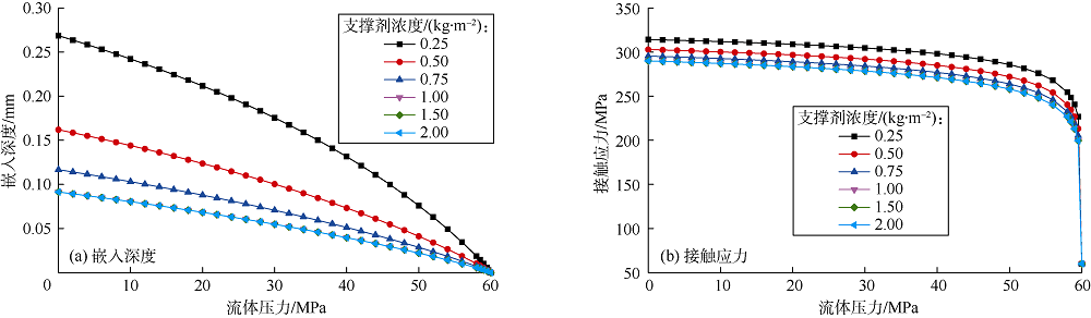 本文所用支撑剂达到最大面密度时的支撑剂铺置浓度为0.95 kg/m2。当铺置浓度大于0.95 kg/m2时, 支撑剂呈现多层分布形式, 但与岩石表面接触的支撑剂面密度仍为单层紧密铺置时的最大面密度, 因此继续增大浓度不会增加与岩石表面接触的承压支撑剂数量。如图6所示, 当支撑剂浓度大于1.00 kg/m2时, 支撑剂嵌入深度和接触应力不再发生变化, 与前述分析一致。图6a显示, 不同缝内流体压力条件下, 支撑剂浓度0.25 kg/m2时的嵌入深度是1.00 kg/m2时的嵌入深度的2~3倍, 即当支撑剂为单层稀疏分布时, 支撑剂浓度越大, 支撑剂嵌入深度越小。