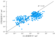 孔隙度和孔隙结构对渗透率的控制, 主要源于孔喉大小及其占比。连通孔喉较粗且占比较高则渗透率较高, 反之孔喉较细且占比较高则渗透率较小。不同大小孔喉对渗透率的贡献可由(1)式确定[14]: