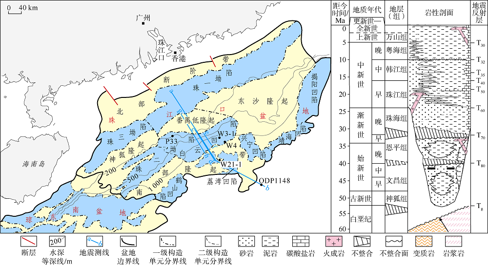 油气勘探经历了先陆地后海洋、先浅水后深水的发展, 这不但是基于勘探工程技术的发展, 也与基础地质和油气地质的认识程度有关。长期以来, 人们对陆缘深水区盆地结构的认识主要来自易于获取资料的浅水陆架盆地[1]。按照传统伸展模式, 认为陆缘深水区盆地具有与陆内盆地和浅水区盆地相似的结构样式, 即以高角度正断层控制的断陷盆地系为特征[2], 深水盆地的油气地质特征与陆内和浅水盆地相似, 浅水区的勘探模式可以用于指导深水区的勘探。然而, 南海北部深水区珠江口盆地白云凹陷经过近10年的勘探实践和研究, 在发现了一批油气藏的同时, 也揭示出一系列与浅水区盆地迥异的特殊地质现象:①白云凹陷高角度控洼断裂并不明显, 为何能形成又宽又深的断陷, 属坳陷还是断陷长期存疑[3, 4, 5, 6]。②根据传统的伸展模式, 断陷盆地形成及其力源机制应是多幕次, 并且是迁移的[6, 7]; 据此曾认为, 南海北部新生代断陷盆地沉积具有从陆向洋逐渐迁移和变新的趋势, 并推断陆内盆地的沉积始于古近纪早期, 向洋逐渐变新[6, 8, 9], 白云凹陷开始沉积的时间较晚, 为始新世晚期[7]。按照上述认识, 尽管白云凹陷沉积巨厚, 但应当缺少多数断陷主要烃源岩发育期的中下始新统文昌组; 若如此, 烃源潜力的评价结果就要大打折扣。但是近年的深水勘探已经钻遇了文昌组[10], 表明传统模式存在问题。③地震解释结合重磁震联合反演, 发现并证实了由几乎断穿地壳的大型低角度拆离断裂系控制的洼陷结构特征[11]。白云凹陷的结晶地壳厚度很薄, 仅几千米, 地壳减薄与莫霍面(Moho面)上隆呈镜像关系, 且下地壳伸展程度大于上地壳[12, 13, 14], 明显不同于陆内和浅水区的盆地。地壳薄化程度以及与浅水区典型半地堑不一样的凹陷结构特征, 意味着深水区的油气地质条件具有特殊性。④断陷期地壳薄化最为强烈的白云凹陷, 在随后的拗陷期也出现了高于陆架浅水区正常断陷盆地的强烈热沉降[8], 不但沉积了厚达6 000 m的地层, 而且演化为持续的深水盆地, 显现出受特殊的沉降机制控制。⑤深水钻探揭示了白云凹陷具有极高的地温梯度[12, 15, 16], 表现出高地温梯度作用下的烃源岩生烃、砂岩储集层成岩作用和油气成藏等的特殊性。