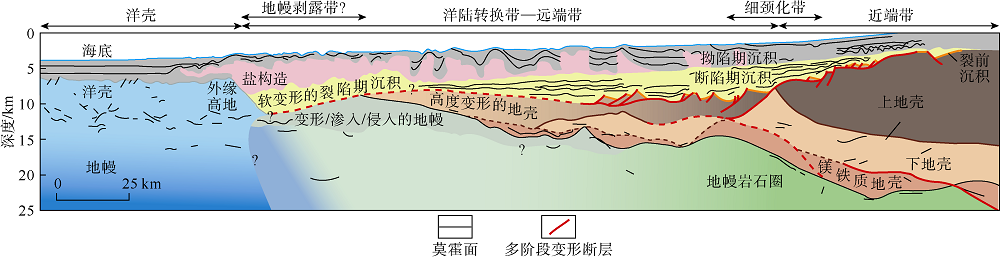 被动陆缘经历了完整的伸展演化过程, 总体上从陆缘的内侧陆架区到外侧的陆坡区, 随着岩石圈薄化程度的提高, 变形越来越向岩石圈最后裂解成洋的方向迁移和集中, 最后完全集中在扩张中脊释放区域拉伸应力(见图4)。从大陆岩石圈伸展、薄化、地幔剥露和裂解的递进变形过程中, 表现出幕式伸展、应变集中及变形迁移和转化[11, 40, 41]。陆缘伸展作用首先从纯剪切伸展脆性上地壳破裂, 形成均匀分布的、由高角度断层控制的窄条状断陷群开始, 然后是脆性层高角度断层继续深切, 进入上下地壳脆韧性带, 由于上下地壳在伸展作用的应变差异而产生拆离面, 此后的伸展作用应变集中到下地壳, 使下地壳韧性层产生明显的韧性流变, 上地壳断裂的上盘则因下地壳的韧性伸展而沿着拆离面被拉开滑移产生巨大的位移量, 早期的窄条状断陷演变为宽深断陷(见图5、图6), 持续的深部伸展作用可以导致下地壳被进一步拉薄甚至缺失, 最终地壳岩石圈完全破裂, 地幔岩石圈被剥露出来[42]。