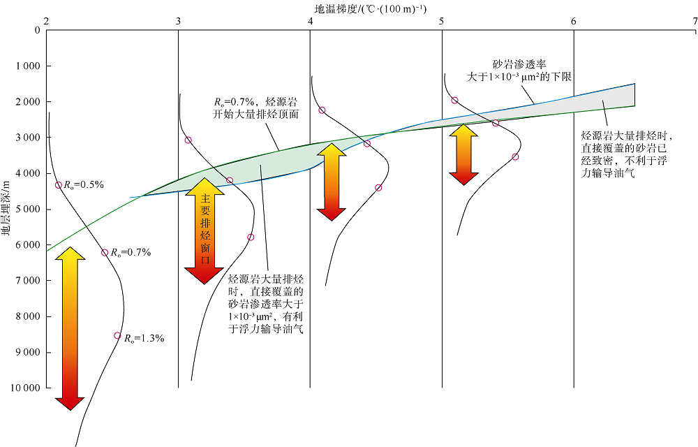 地温梯度升高, 有利储集层下限变浅, 生烃窗口(Ro值为0.7%~2.0%)会变得更窄(见图10)。地温梯度为(3.0~4.0)℃/100 m时, 处于油气大量生成和排烃的早期, 周边的砂岩渗透率普遍仍然较好, 能够以浮力的形式排出和输导油气, 易于形成常规油气藏。当地温梯度大于5.0 ℃/100 m时, 烃源岩大量排烃时周边砂岩已经致密, 毛细管阻力大, 难以以浮力的形式输导油气, 因此, 生烃超压、相势驱动、幕式排烃[51]可能是主要成藏模式。