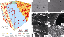 压汞实验及微观观察揭示, 大安寨段介壳灰岩储集空间大于1 µ m部分占总孔隙体积的8.73%, 主要由微裂缝组成; 小于1 µ m部分占91.27%, 主要由纳米级微裂缝和孔隙构成。定性和定量方法揭示储集空间整体上呈现“ 狭缝形” 特征, 纳米CT数字孔喉重构则确定了每个孔隙普遍与2~4个喉道连通。建立微米级和纳米级储集空间三维结构模型, 直观展现介壳灰岩的微观结构特征。
