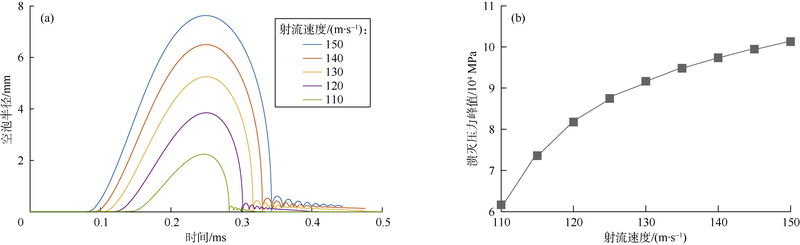 设定围压为6 MPa, 自振效应系数为1.24, 流体介质为清水, 计算不同射流速度下空泡半径随时间的变化(见图6a)。结果表明, 增加喷射速度能大幅提高空泡生长所能达到的最大半径。由图6b可知, 溃灭压力峰值随射流速度的增大而升高, 但升高幅度逐渐减小。由(6)式— (9)式可知, 增加射流速度能增大压降幅度, 但也会使压降持续时间缩短。在射流速度较小时, 压降持续时间较长, 空化气泡能充分发育, 压降持续时间缩短对空泡发育所能达到的最大半径影响较小。但在射流速度较大时, 压降持续时间已经很短, 进一步缩短对空泡发育影响较大, 从而减小溃灭强度的提高幅度。