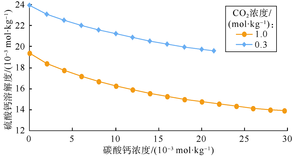 发现残余砂屑细晶白云岩样品中的硬石膏未见明显溶蚀痕迹, 分析其原因可能与乙酸为弱酸、难与硫酸钙反应有关, 且乙酸易与碳酸钙或碳酸钙镁反应生成大量钙离子, 由于同离子效应[27]使硫酸钙更难溶于水溶液中。为了验证这一推测, 采用CO2-H2O-CaCO3- CaSO4-NaCl模型[28]计算了碳酸钙和硫酸钙的溶解度, 受模型限制, 由于二氧化碳溶液和乙酸均为弱酸, 本文实验以二氧化碳溶液近似代替乙酸溶液。图7表明在65 ℃、20 MPa、NaCl浓度为0.17 mol/kg的条件下, 硫酸钙溶解度随着二氧化碳浓度增加而减小, 同时也随着溶液中碳酸钙含量的增加而减小; 图8表明硫酸钙和碳酸钙均充足的情况下, 早期溶液中不含二氧化碳, 硫酸钙溶解度是碳酸钙的816倍, 随着温压的升高, 溶液中二氧化碳含量逐渐增加, 同时硫酸钙溶解度逐渐降低, 而碳酸钙溶解度迅速增加且超过硫酸钙溶解度, 当二氧化碳浓度增加到1 mol/kg时, 硫酸钙溶解度降到一个极小值, 之后随着温度、压力的增加, 呈先增大后减小的趋势, 但始终比碳酸钙溶解度小。