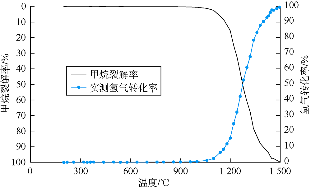 理论上, 依据烃类生成自由能变化与温度函数关系(化学反应动力学)可知, 甲烷裂解过程可以简化为一个化学反应方程式:CH4==C+2H2, 可以看出, 甲烷裂解的气体产物为氢气。在没有其他氢源的情况下, 氢气的生成趋势可以反映出甲烷的裂解趋势。本文利用高温热解炉结合气相色谱-质谱联用检测的方法在线标定了升温过程中甲烷与氢气含量的变化趋势。具体实验方法是, 将甲烷气体注入高温裂解炉进行常压条件下恒温裂解实验, 裂解产物用质谱在线检测氢气及甲烷含量。