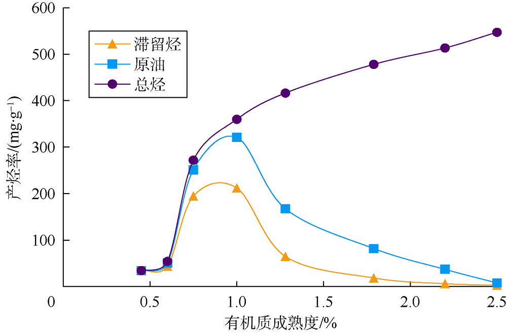笔者利用上文所述的地层条件下生排烃模拟方法对本次研究的对象— — 下马岭组泥页岩进行了生排烃模拟实验, 得到了滞留烃、原油及总烃的演化曲线(见图3)。由图3可见下马岭组页岩在生油高峰时Ro值为1.0%左右, 产烃率高峰值为321 mg/g, 占此时生烃量的89.2%; 此时滞留烃产量也达到峰值, 为212.9 mg/g, 然而本阶段累计生气量只有39 mg/g, 仅占生烃量的10.8%。直到高成熟阶段原油开始大量裂解, 才使得天然气的含量大幅增加。