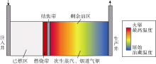火驱过程中(见图3):注入井至燃烧带间的区域为已燃区, 含油饱和度为0; 燃烧带右方存在原油高温反应生成的结焦带; 结焦带至生产井间则为剩余油区域。剩余油区域中接近燃烧带的区域温度高, 远离燃烧带不受影响的区域温度为原始油藏温度, 因此剩余油区域温度变化幅度较大[13]。剩余油区域受高温蒸汽和烟道气驱替作用, 表现为受温度影响的非混相气驱区域。