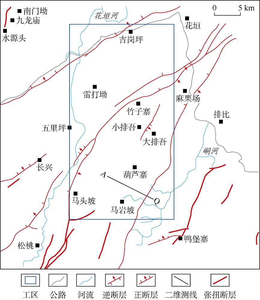 研究区位于湖南省花垣地区, 由北东— 北北东向展布、被断层复杂化的线性褶皱组成, 区内向斜宽缓, 背斜相对紧闭, 主要断裂有与褶皱轴线近乎一致的北东向逆断层和与褶皱轴线略斜交的正断层、张扭断层, 断距较大, 延伸较远(见图10)。应用视电流法对研究区QA测线进行断层发育位置推断, 并对原始资料解释的可靠性进行验证。