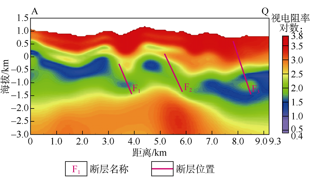 QA测线的广域电磁法浅部电阻率变化情况见图11, 其表征了测线所经过地层电阻率的相对大小, 有利于了解研究区地层的层序关系﹑接触关系和空间变化的关系, 对识别地下深部构造空间展布情况具有重要意义, 为断层的初步推断提供参考依据。