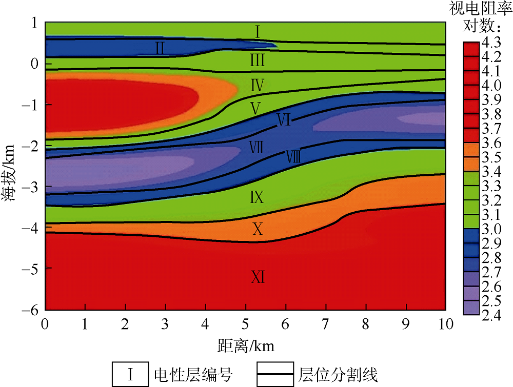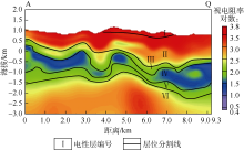 在地层岩性及地质露头等资料的综合约束下, 采用最优分割法, 对研究区广域电磁勘探资料的视电阻率信息进行合乎地质变化规律的电性层划分(见图13), 由浅至深共划分出Ⅰ — Ⅵ 共6个电性层, 依次对应视电流ia1— ia6(见图14)。