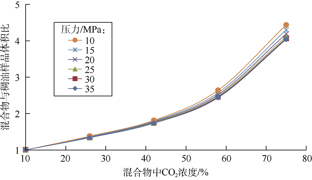 混合物与稠油样品体积比与混合物中CO2浓度的关系曲线显示(见图4), 随着注入压力从10 MPa增加到35 MPa、CO2浓度从10%增加到75%, 混合物体积平均是稠油样品体积的4倍, 主要是由于轻相体积增加而导致的。