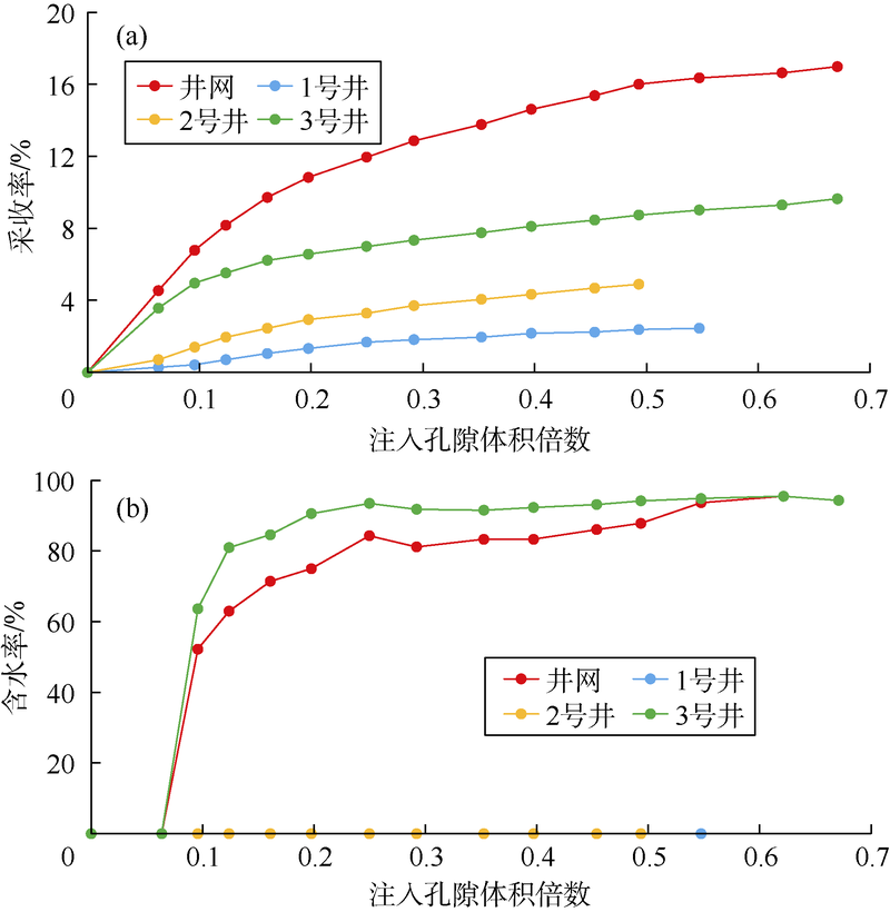 直接采用九点井网注水驱替(实验2)的开发指标(见图8)表明, 该井网无水采收率16.79%, 最终采收率34.36%, 均明显优于五点井网和五点转九点井网; 3口井同时生产时, 1号井始终未见水但产量非常低, 2号、3号井距离注水井更近, 渗流阻力较小, 受益快, 产油量较高。