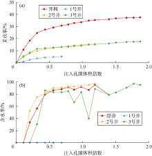 无裂缝溶蚀孔洞型储集层五点井网及高含水期转九点井网(实验1)开发指标(见图7)显示, 五点井网无水采收率7.93%, 最终采收率12.83%(见图7a), 高含水期含水率在85%~100%波动(见图7b); 转九点井网后, 综合含水率大幅下降, 采收率快速升高, 最终采收率达28.97%, 比五点井网提高16.14%; 转九点井网后, 1号井仅产极少量水(见图7c), 2号和3号井生产效果较好, 且初期采收率上升较快, 说明五点井网注水过程中, 注入水沿注采井连线窜进, 主流线两侧剩余油较多。