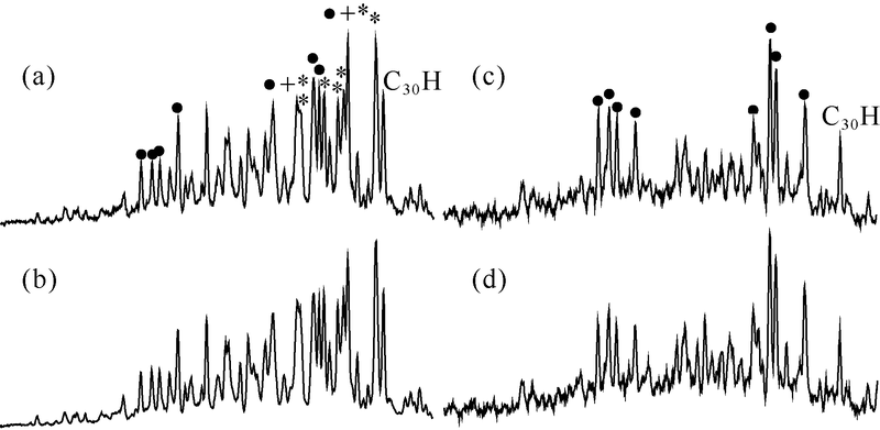 | 图4 4个原油样品饱和烃馏分GC-MS总离子流图 (a)塔中11井, 取样层段4 301~4 307 m, 取样层位S; (b)塔中30井, 取样层段4 997~5 026 m, 取样层位O; (c)英买101井, 取样层段5 912.5~5 917.0 m, 取样层位O; (d)英买201井, 取样层段5 844~5 888 m, 取样层位O |