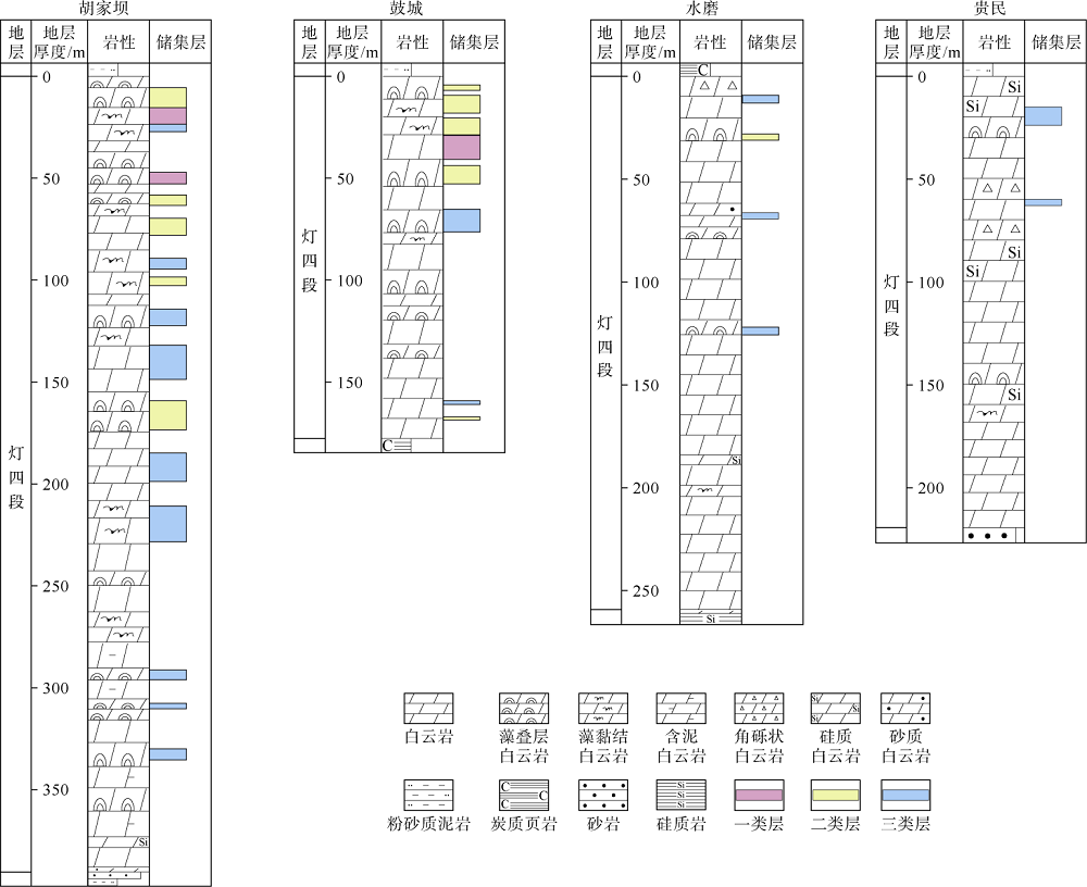 通过对研究区宁强胡家坝、旺苍鼓城、旺苍水磨、南江贵民等剖面的研究, 纵向上, 灯四段储集层主要发育在中上部— 顶部; 顶部物性最好, 尽管有较多沥青及少量石英的充填, 面孔率最大仍超过15%; 往下物性逐渐变差, 到下部几乎无储集层的分布。横向上, 宁强胡家坝剖面处于拉张槽(斜坡-盆地)东侧的台地边缘, 丘滩复合体发育, 灯四段储集层发育程度最好, 其次为靠近台地边缘的鼓城剖面; 水磨剖面和贵民剖面因处于台地内部, 仅分布有一定数量的台内丘滩复合体, 储集层发育相对较差(见图10)。因此, 埋藏期溶蚀作用是灯四段优质储集层形成的关键, 有利的沉积相带与埋藏岩溶作用的叠加是灯四段储集层形成的主要原因。